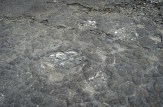 Desiccation cracks and dinosaur track (Sauropod) in limestone (Upper oxfordian, Loulle, Jura).Etudes des traces de dinosaures à Loulles dans le Jura.