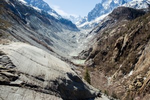 La mer de glace en 2015 , au premier plan les stris glacaire du petit age de glace. Analyses géomorphologiques traces glaciaires à la Mer de Glace